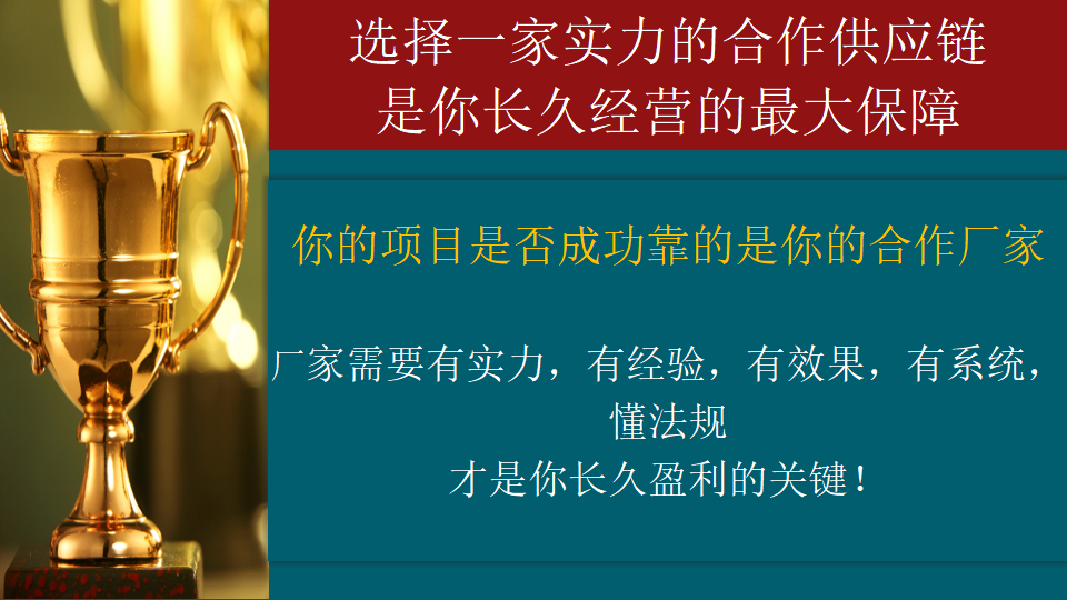 中康佰作为一家35年的企业,23的市场私护产品经验,把每款产品都做成了精品,以人为本,把终端顾客的安全效果和经营者的合法盈利经营放在了第一位。在疫情影响和国家的严厉整肃之下,我们的优质项目反而是未来发展的蓝海。